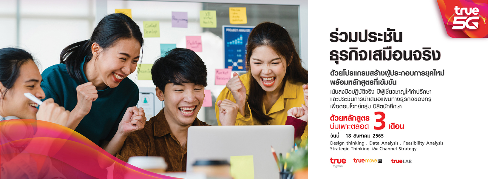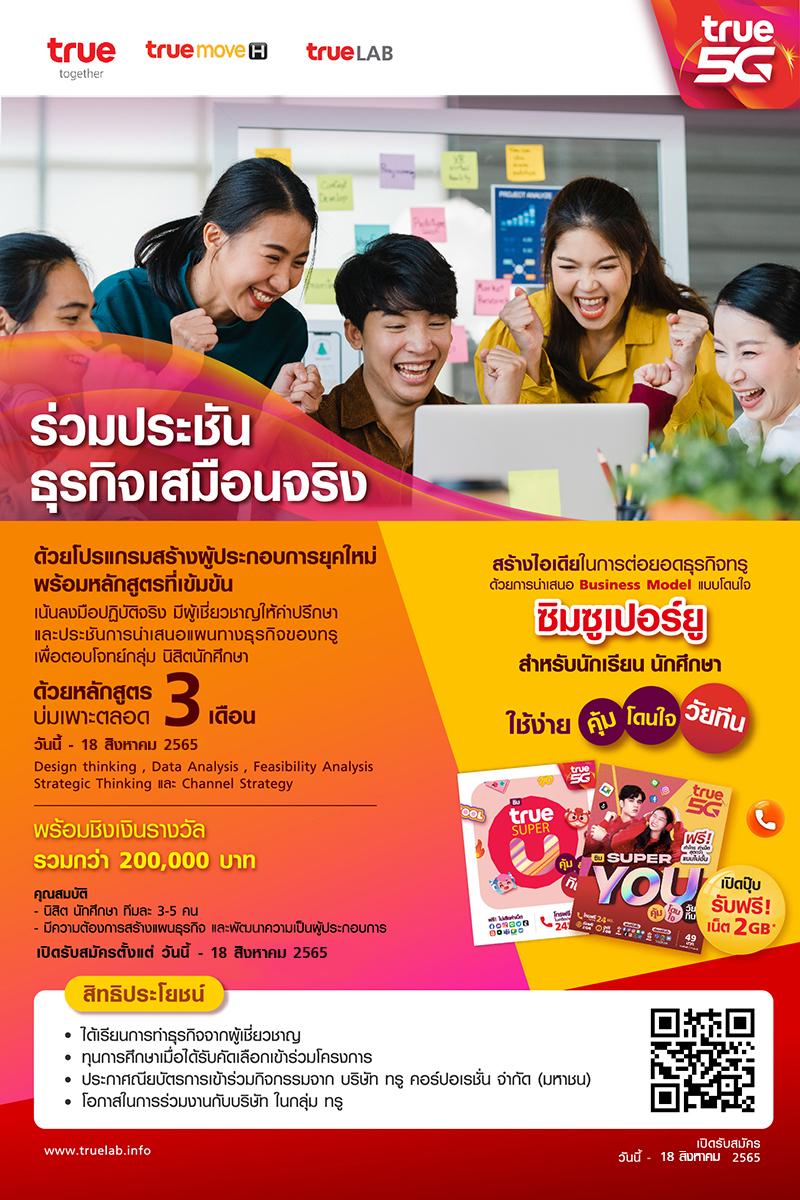 ร่วมพัฒนาความเป็นผู้ประกอบการ ด้วยการบริหารธุรกิจเสมือนจริง เน้นลงมือปฏิบัติจริง มีผู้เชี่ยวชาญให้คำปรึกษา และประชันการนำเสนอ Business Model ของทรู เพื่อตอบโจทย์กลุ่มนักศึกษา ด้วยหลักสูตรบ่มเพาะตลอด 3 เดือน พร้อมชิงรางวัลมูลค่ารวมกว่า 200,000บาท เตรียมทีมให้พร้อม เปิดสมัครตั้งแต่วันนี้ ถึง 18 สิงหาคม 2565